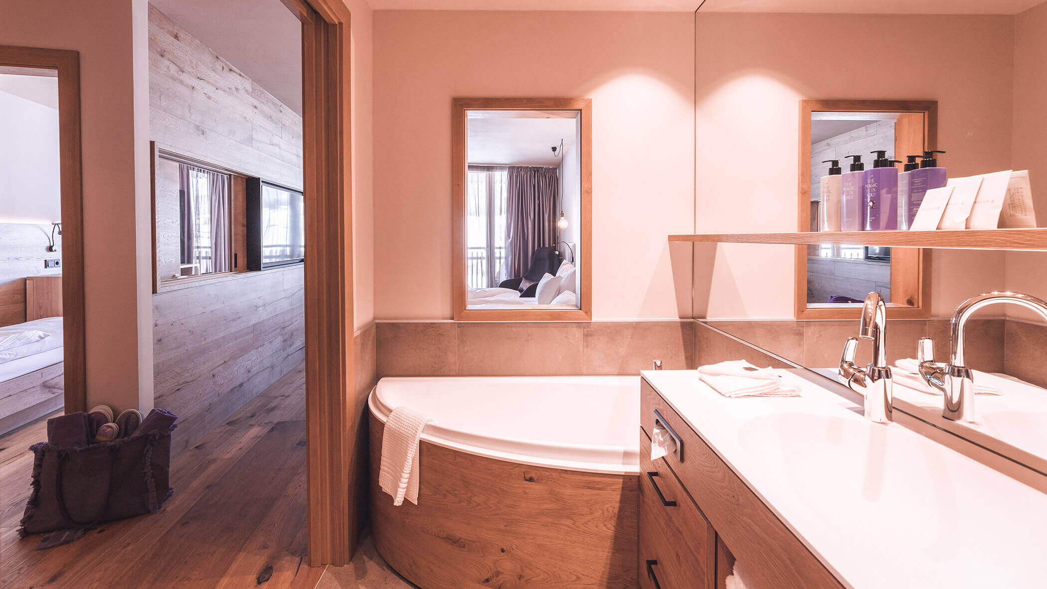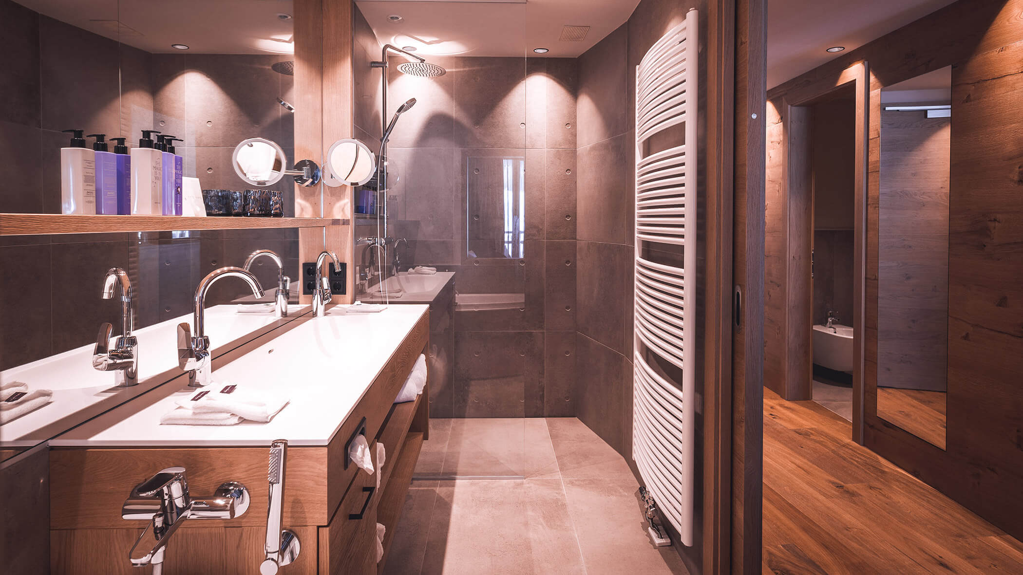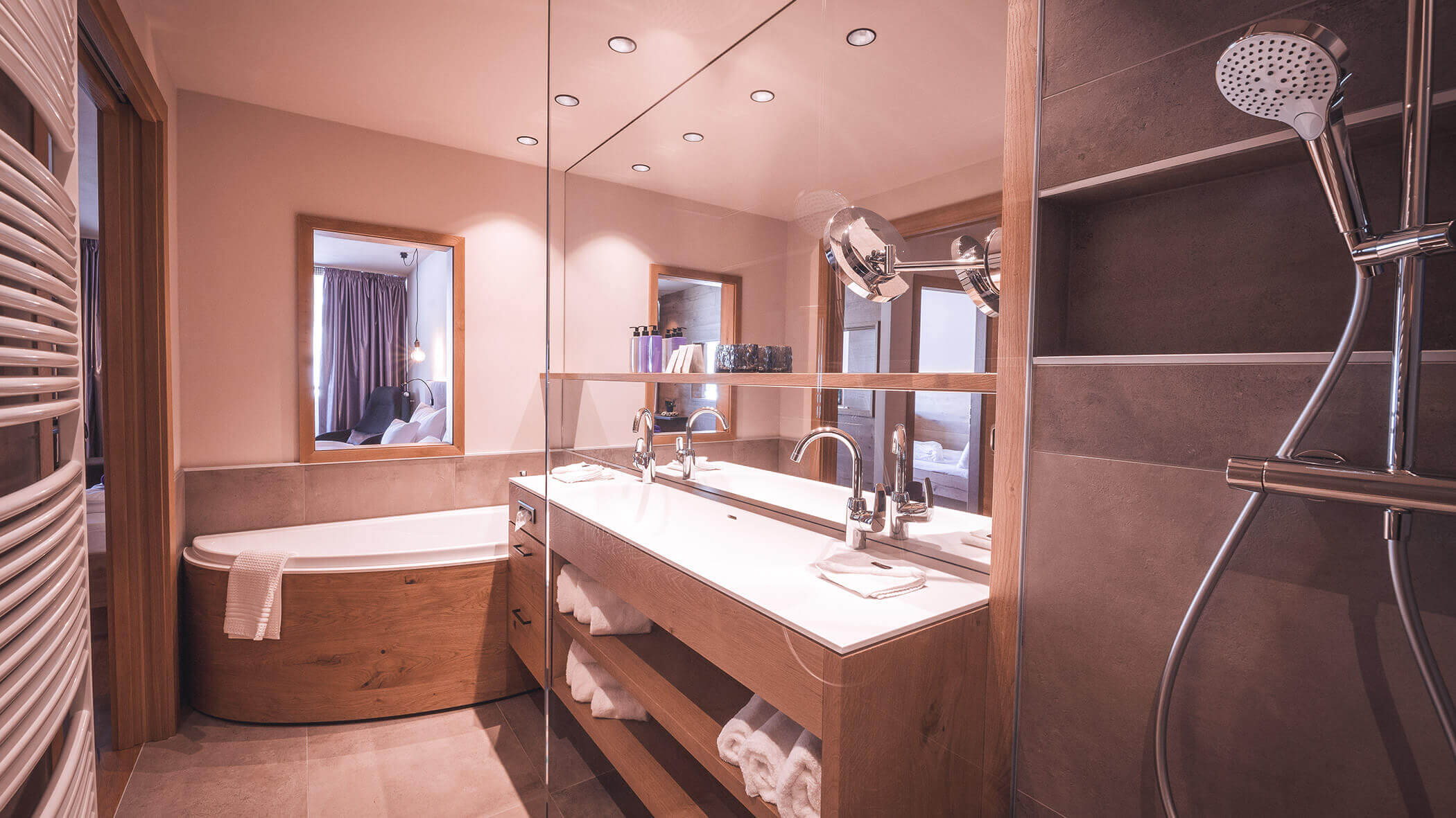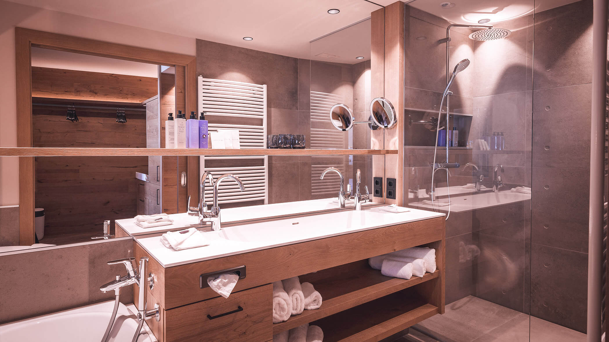 • Bad mit Familienwaschbecken, Kinderbadewanne und Dusche, Tritthocker für Kinder und Wickelablage